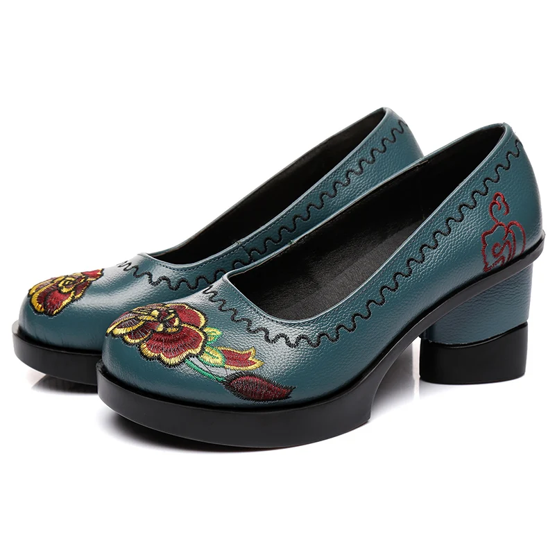 Gktinoo Spring Women Pumps Retro Lady 7cm High Heels Slip On Flower Pumps Handmade Women Genuine Leather Shoes