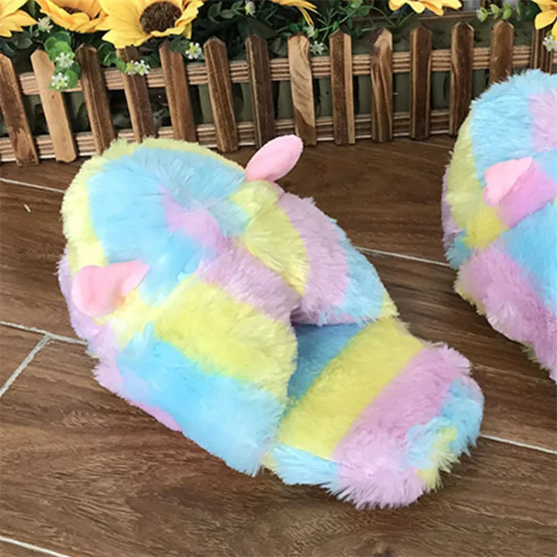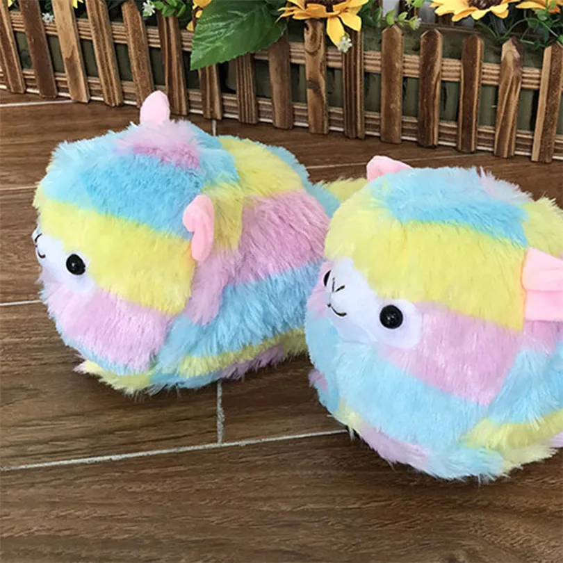 Lin King Cute Colorful Alpaca Fur Slippers Women's Home Indoor Slippers Warm Winter Cotton Shoes Non Slip House Bedroom Shoes